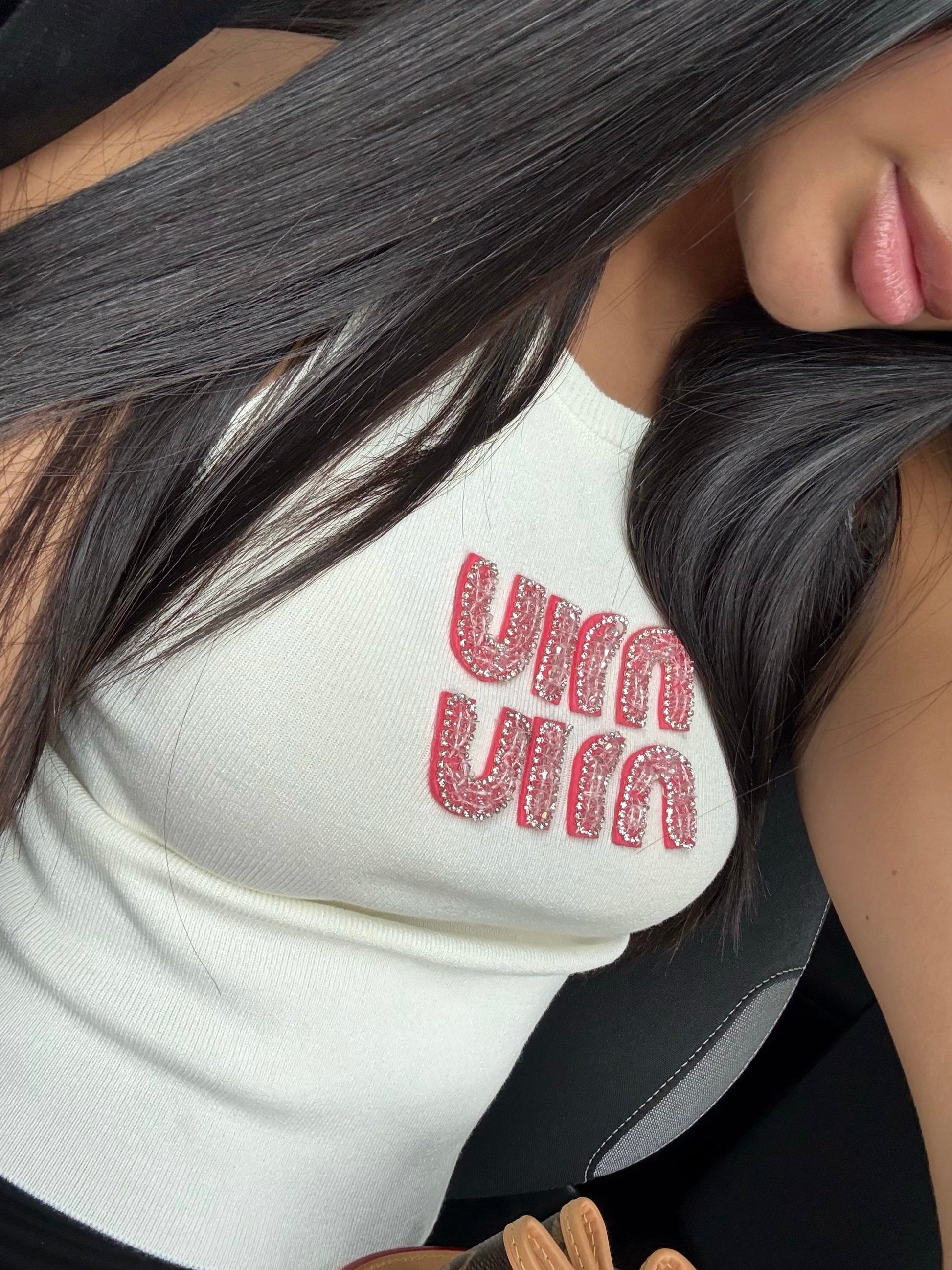 TOP BLANC COTELÉ AVEC LOGO BRODÉ ROSE